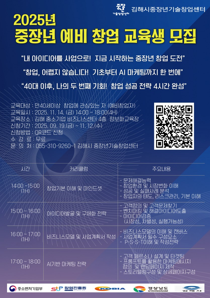 2025년 중장년 Pre-인큐베이팅 창업교육생 모집 김해시중장년기술창업센터는 우수한 사업아이디어와 열정을 지닌 만 40세이상 예비창업자대상 창업교육을 실시하고자 하오니 창업교육에 관심있는 분들의 많은 신청 바랍니다. ○교육규모 : 10명(팀)내외 ○교육대상 : 만40세이상 창업에 관심있는 자(예비창업자) ○모집일정 : 2025.9.19.(금) ~ 11.12.(수) ○교육일정 : 2025.11.14.(금) 14:00~18:00 ○교육장소 : 김해시중소기업비즈니스센터 4층 정보화교육장 ○신청방법 : 온라인신청(구글폼 접수) |