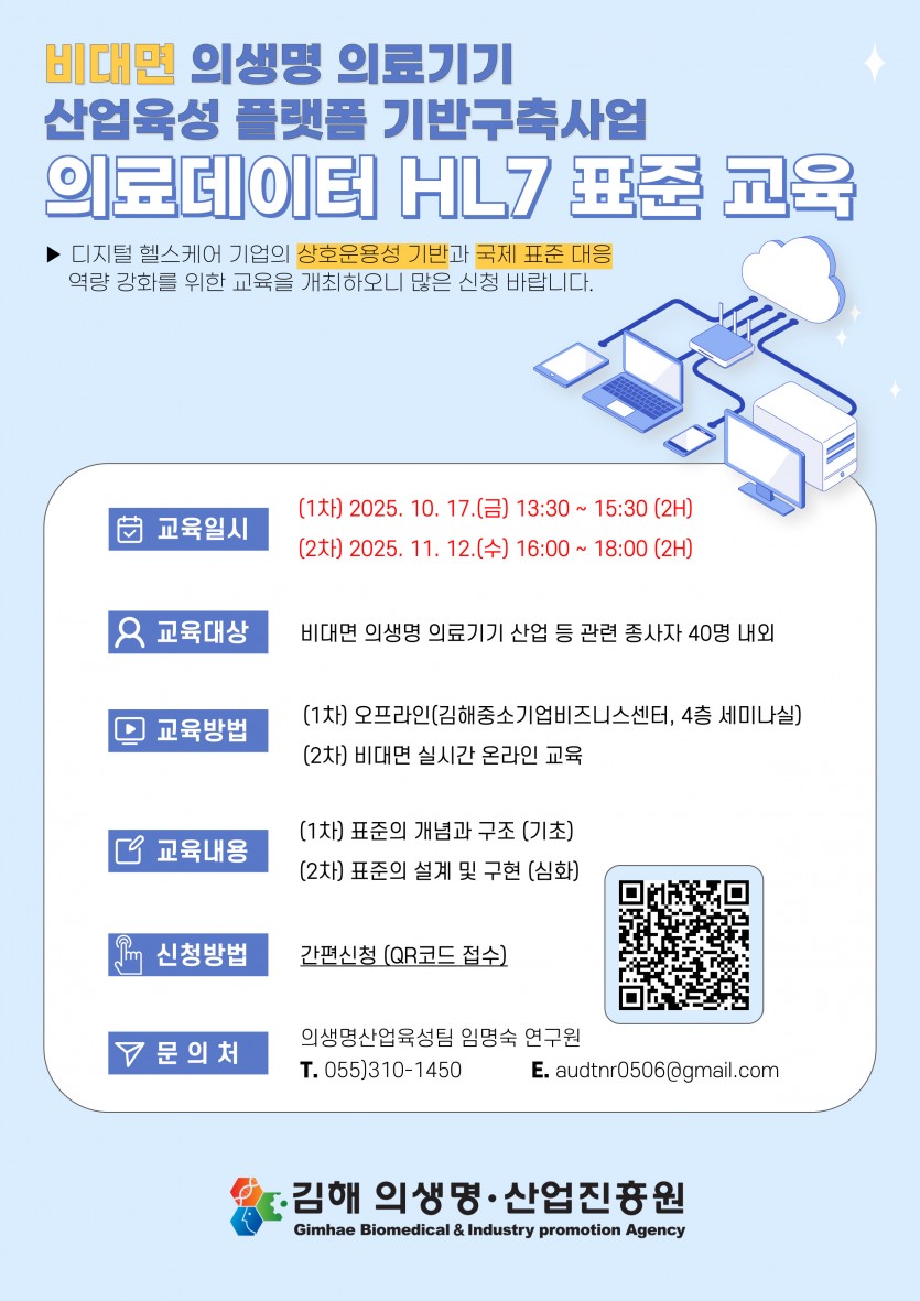 "의료데이터 표준 HL7 교육 프로그램" 교육생 모집 김해의생명산업진흥원과 HL7 Korea가 공동으로 운영하는 『의료데이터 HL7 표준 교육 프로그램』을 안내드립니다. 본 교육은 전국의 비대면 의생명 의료기기 산업 관련 종사자의 HL7 표준에 대한 이해도와 실무 역량을 높이고, 기업의 경쟁력 향상을 지원하고자 마련된 프로그램이오니, 많은 관심과 참여 부탁드립니다. ■ 모집대상 : 비대면 의생명 의료기기 산업 등 관련 종사자 40명 내외 ■ 신청기간 : 2025. 9. 24. (수) ~ 10. 14. (화) ■ 교육기간 : 2025. 10. 17. (금) / 11. 12. (수) [총 2회, 4시간] ■ 교육내용 1) 표준의 개념과 구조(기초) 2) 표준의 설계 및 구현(심화) ■ 교육방식 : 온/오프라인 병행 ■ 교 육 비 : 전액 무료(수료 시 김해의생명산업진흥원 명의 수료증 발급) ■ 신청방법 : 첨부된 신청서 내 QR코드를 통한 구글폼 접수 (https://forms.gle/zTLT41CWSL7tbZQv9) ■ 문 의 처 : 김해의생명산업진흥원 의생명산업육성팀 임명숙 연구원 (Tel : 055-310-1450 / E-mail : audtnr0506@gmail.com) |