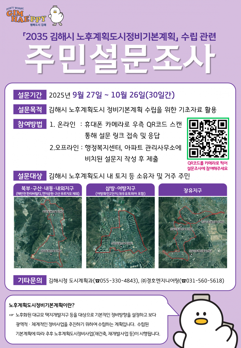 「2035 김해시 노후계획도시정비기본계획」 수립 관련 주민 설문조사 ○설문기간 : 2025년 9월 27일 ~ 10월 26일 (30일간) ○설문목적 : 김해시 노후계획도시정비 기본계획 수립을 위한 기초자료 활용 ○참여방법 1. 온 라 인 : 휴대폰 카메라로 qr코드 스캔, 설문링크 접속 및 응답(https://m.site.naver.com/1PMAd) 2. 오프라인 : 행정복지센터, 아파트 관리사무소에 비치된 설문지 작성 후 제출 ○설문대상 : 김해시 노후계획도시 내 토지 등 소유자 및 거주 주민 ○대상지역(행정동) : 내외동, 북부동, 활천동, 삼안동, 장유1·2·3동 |