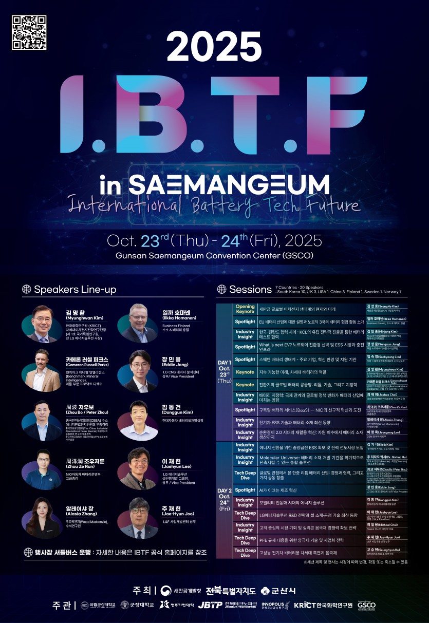 <2025 새만금 이차전지 국제컨퍼런스(I.B.T.F)> ○기간 : 2025.10.23(목) ~ 10.24.(금) ○장소 : 군산새만긐컨벤션센터(GSCO), 베스트웨스턴 ○사전등록 : http://www.ibtf.kr/bbs/write.php?bo_table=Registration ○주요내용 : 글로벌 배터리 공급망 재편과 차세대 기술 혁신을 논의하며, 새만금을 중심으로 지속가능한 이차전지 산업 생태계 구축 방향 논의 |