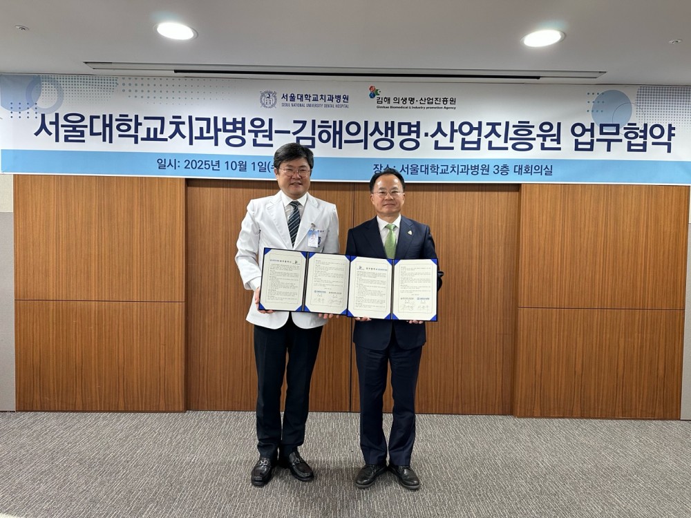 [2025. 10. 1.] 김해의생명산업진흥원-서울대학교치과병원 업무협약 - 지역기업 성장과 글로벌 경쟁력 강화를 위한 업무협약(MOU) 체결 - 첨단 연구 인프라와 지역기업 지원 연결하는 협력 플랫폼 구축 - 공동연구·인력교류·창업기업 육성 등 다각적 협력 추진 |